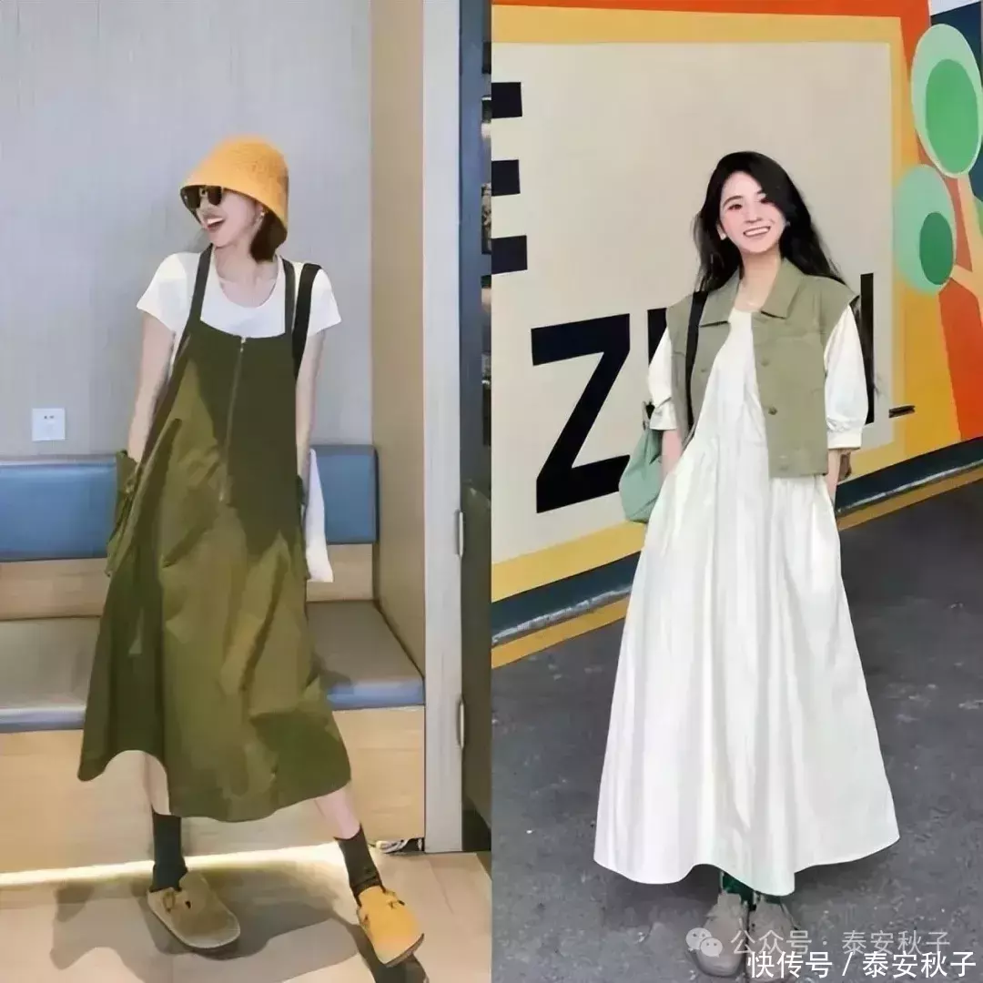 比如绿色背带裙配白色棉质 T 恤就很好,宽松的裙型显得人随性自在,颜色搭配和谐,看着就很舒服。
